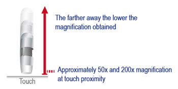 Har friheten att förstora från 20x till 50x ju närmare Dino-Lite är till målet, med hjälp av Dino-Lite ratten för att fokusera för varje förstoring. Uppnå ytterligare 200x när Dino-Lite är på nära håll.