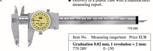 Tesa skjutmått med analog mätklocka mätområde 0-150 mm, gradering 0,02 mm, 1 varv = 2 mm