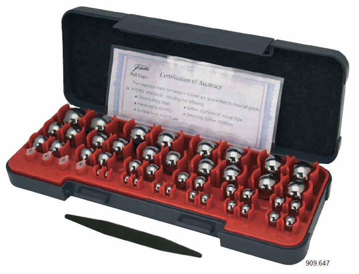 169 krStålmätkulor, kromlegerat stål, hårdhet 63 HRC, nominell dimensionstolerans <2,5 µm, rundhet <0,6 µm, ytjämnhet <0,05 µm, 2 kulor per storlek, levereras med konformitetsdeklaration, 24 mm