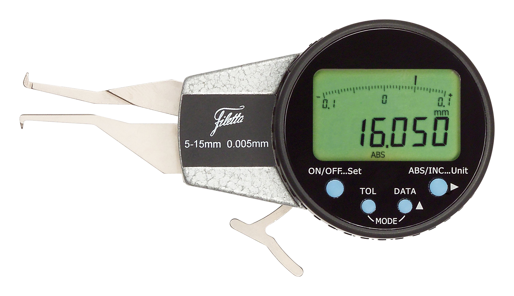 Mätklockan har en lätt avläsbar graderad skala och en justerbar mätkraft för konsekvent och repeterbar mätning. Instrumentet levereras med härdade mätspetsar som säkerställer lång livslängd och beständighet mot slitage. Dess ergonomiska utformning tillåter bekväm hantering även vid långvarig användning, medan den robusta konstruktionen skyddar mot stötar och damm i krävande miljöer.